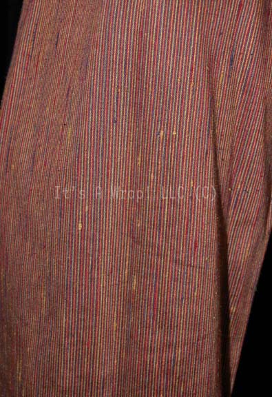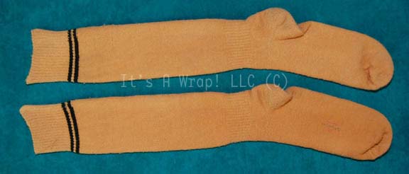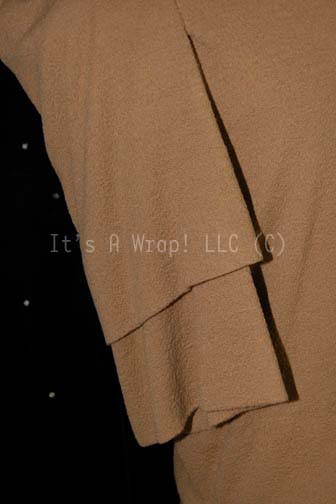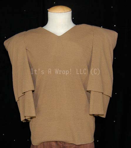 Description: A Roman civilian costume like those seen in Star Trek: The Next Generation episodes like both of the “Unification” arc. This costume consists of a long-sleeved, brown jacket of the large-shouldered, blocked off, Romulan-style, brown, legging-type trousers and peach-colored knee socks with black stripes. A sewn in tag in both items denotes wear by ‘Mark Lentry’ and a costumer’s tag reads ‘#207 Unification Pt II, Romulan civilian, Mark Lentry’.