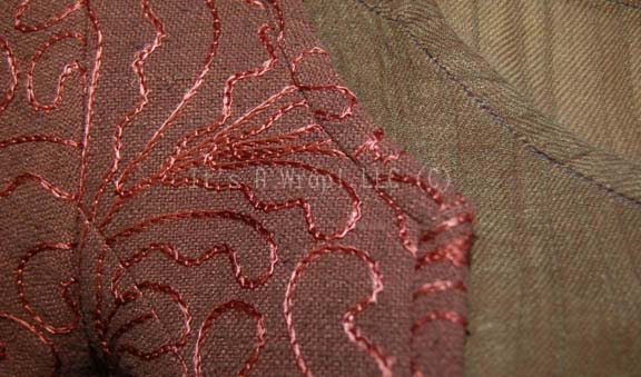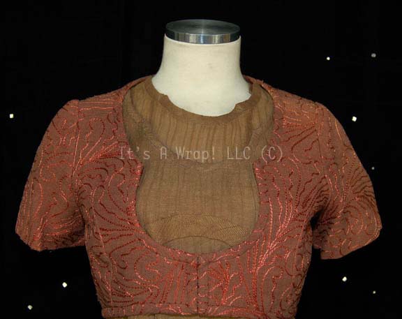 Description: A costume featured in various episodes of Star Trek: Deep Space Nine for wear by Nana Visitor as “Major Kira Nerys”. This costume is composed of a sleeveless, sheer, brown dress featuring raised vertical stripes, and is secured by several snaps on the left shoulder. A corresponding, short-sleeved, mid-riff shirt with a plunging neckline in included for wear over the dress. A sewn in Deep Space Nine tag in both items reads ‘Nana Visitor’.