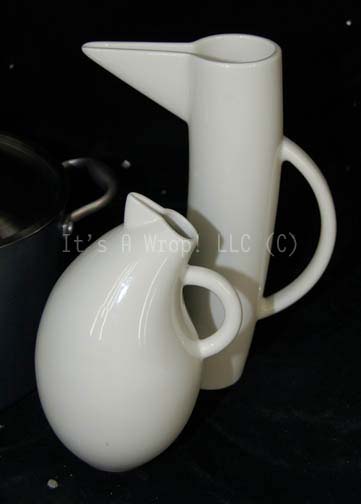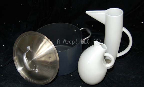 Description: A pair of pitchers and a metal cooking pot appearing as set dressing in the Star Trek: Voyager episode “Human Error”. The items appeared on the set of “Seven of Nine’s” (Jeri Ryan) holographic quarters while she investigated her humanity. The items are a pair of white ceramic pitchers made in an ultra modern style, yet still practical, each featuring a unique shape with similar handles. Both feature an application on the base reading ‘Arabia Finland Storybirds’. They measure approx. 9.5 X 10 inches diameter and 10.25 X 3 inches diameter with a 3 inch profile pouring spout. The cooking pot is a dishwasher safe “Anolon’ name brand titanium pot with a silver colored lid. The item measures approx. 9.75 X 10.75 inches diameter. The pot is slightly warped and as such the lid does not currently fit flush.