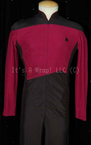 Description: A costume featured in various episodes of Star Trek: The Next Generation from the third season on and was reused in Star Trek: Generations. This costume is a Starfleet uniform jumpsuit featuring black shoulders, a Command Red chest, back, sleeves, and piping around the Mandarin collar; a black waist and legs that end in stirrups. This particular uniform has a zip down the front and features a Velcro patch on the left breast for a commbadge (sold separately). A sewn in Star Trek VII tag reads ‘Steve Diamond’ and a second tag set the size at 40.