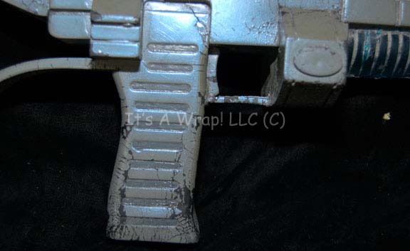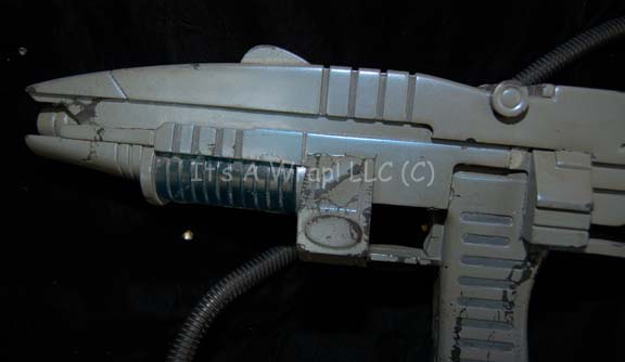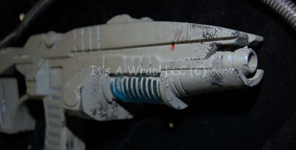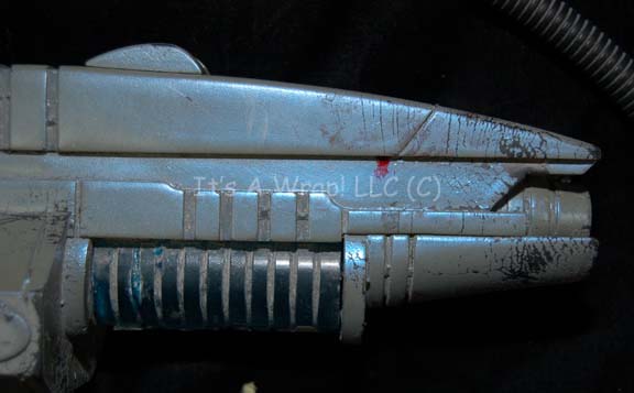 Description: A soft foam rubber molded Andorian carbine like those appearing in episodes of Star Trek: Enterprise like “The Andorian Incident” and “Cease Fire”. The item is painted iridescent blue with a translucent accent and a shoulder strap. The paint is cracked along several of the raised points and surfaces of frequent handling. The item measures approx. 17 X 6.5 X 3.5 inches and represents the last know available Andorian prop firearm in the collection.