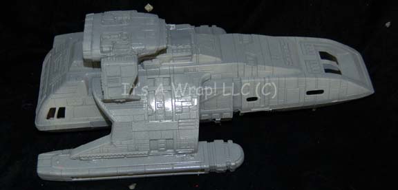Description: A scale model of a Federation runabout like those appearing in multiple episodes of Star Trek: Deep Space Nine. The item is injection molded plastic painted gray with multiple raised features and openings for view ports. The item is fashioned from several pieces of plastic adhered together and measures approx. 12.5 X 7.25 X 4.5 inches. Remains of adhesive used for a motion control mounting rod are present on the ventral side.