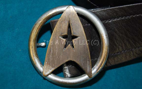 Description: A costume accessory appearing in Star Trek feature films from Star Trek II: The Wrath of Khan through Star Trek VI: The Undiscovered Country. The item is a black leather belt with a metal Starfleet emblem buckle. The gold colored paint on the buckle is worn and depicts evidence of rubbing away but indicates the wearer to be an officer. The item measures approx. 32 inches.