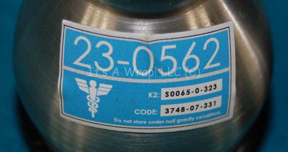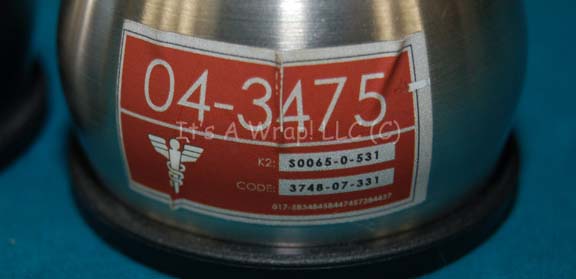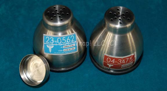 Description: A pair of set dressing items appearing as part of the sickbay set variously in episodes of Star Trek: Enterprise. The items are fashioned metal salt and pepper shakers with removable plastic bases and metal caps. The sides are adorned with Starfleet inventory applications colored red and blue. The items measure approx. 2.5 X 2.5 inches diameter.
