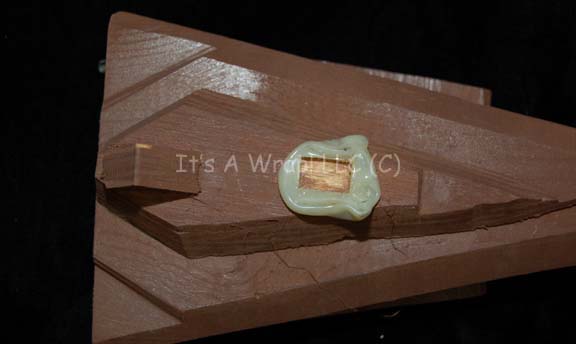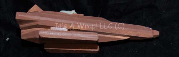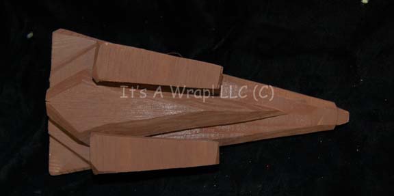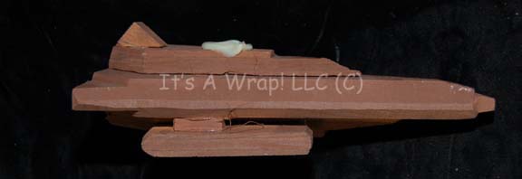 Description: A carved wood camera test model created for use during pre-production on episodes of Star Trek: Deep Space Nine and possibly The Next Generation. The item is composed of multiple carved wood elements adhered together and painted brown. The item features the remains of adhesive glue where a motion control rod was mounted on the dorsal side. Measures approx. 8.25 X 2.5 X 4 inches.