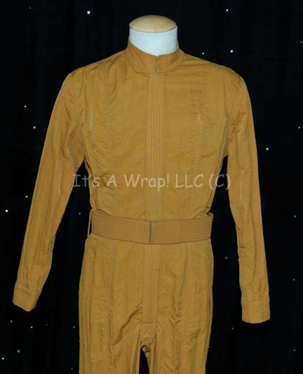Description: A costume featured in the tenth Star Trek feature film “Nemesis”. This costume is a long-sleeved, full-length, jumpsuit in Operations Gold with a placket over the zip down the front, and a matching belt. A sewn in Muto Little Costuming tag is present on both items, a sewn in tag on the belt reads ‘Kevin Moon, DEC 2001’, and a similar tag in the jumpsuit has an illegible name but ‘Nemesis’ is able to be made out on it.