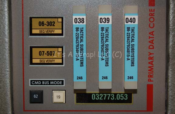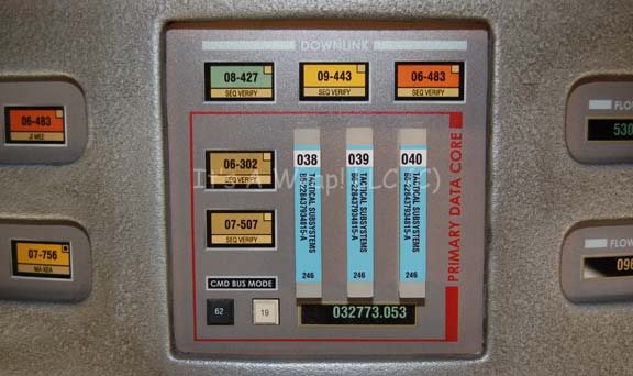 Description: A set piece appearing variously in episodes of Star Trek: Enterprise listing it as a computer console interface for the ‘Primary Data Core’ on the “Enterprise NX-01”. The item is vacuum formed plastic painted metallic silver with an acrylic sheet affixed to the interior that is visible through inset cut outs in the plastic. The acrylic appears is made to be back lit by an external light source and depicts multiple instances of ‘flow rate’, indicator lights, and is adorned with the ends of three statically positioned ‘data modules’ listing them as ‘signal processing’ and ‘mission operations’. The item was part of a larger set piece and was carefully removed prior to set strike. Measuring approx. 22.5 X 8 X 3.5 inches, this item may have appeared in a differing configuration in the Star Trek: Voyager episodes “Workforce, Parts I and II”.
