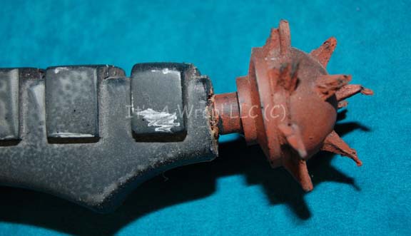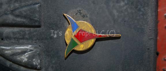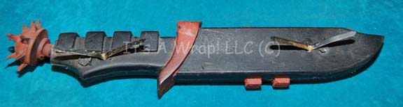 Description: A Klingon knife made for use in Star Trek episodic television. Made of foam rubber the knife is painted black and brown, has faux spikes at the top of the hilt, many textured along the front and back, a small Klingon symbol near the bottom and, on the reverse side, metal clips for attaching the knife to a costume. The item measures approx. 14 x 3 x 1.5 inches.