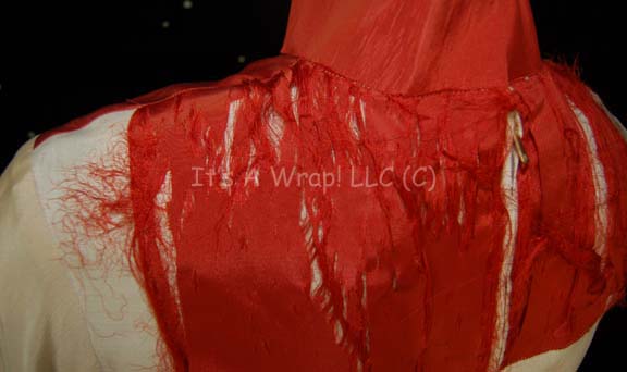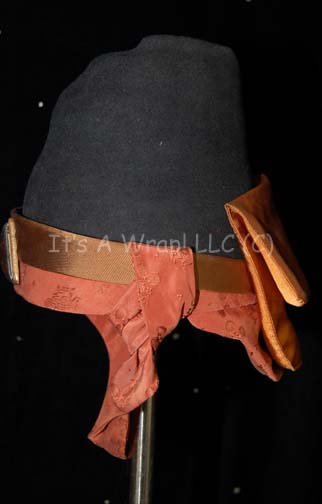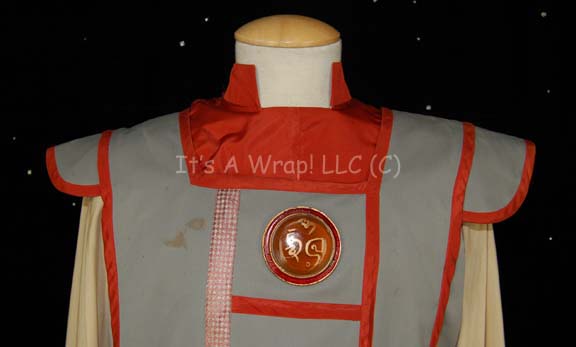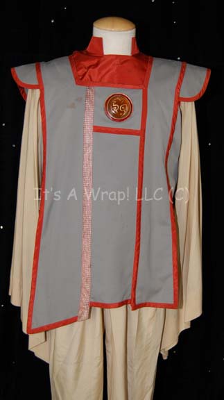 Description: A costume of the style featured in various Star Trek feature films. This costume consists of an off-white under tunic featuring a rust-colored dickie sewn on, large, tan, bell-sleeves of a slightly finer grade of fabric, and matching trousers. A sleeveless, gray tabard featuring stripes that match the dickie, a pink and white checkerboard pattern down the front, and a circular, faux jewel with Vulcan iconographic symbols. Included is a black felt hat in the Vulcan-style featuring copper-colored trim and accent, further rust-colored trim forming a chinstrap and a similar, triangular faux jewel. The back of the sewn on dickie is quite worn and thrashed inexplicably and there are small stains due to time and storage. A sewn in Paramount tag in the costume reads ‘2-1’ and a tag in the hat reads ‘2-8M’.