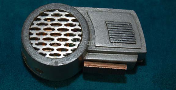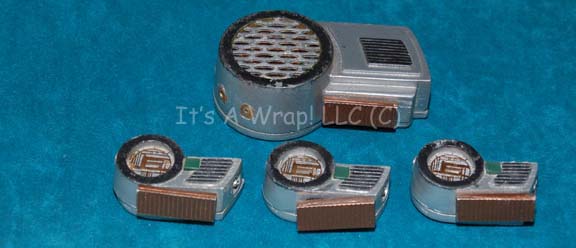 Description: A lot of prop items featured on the ‘interface’ device “Geordi La Forge” wears in the Star Trek: The Next Generation episode “Interface”; wherein “Geordi La Forge” (LeVar Burton) ties the sensor of a special probe into his VISOR so it seems as if her is experiencing what the probe senses and has repeated encounters with an entity he believes to be his mother. This lot consists of a silver-colored device with a rounded end and featuring what looks like a screen, a copper-colored sliding button on the top that activates untested electronics meant to make the device blink. Access to the device is made through four screws on the reverse. Included are three smaller versions of the same device minus the silver-colored ‘screen’ on the front but with the same copper-colored slider switch and untested electronics. The largest item measures approx. 3 X 1.5 X 2 inches and the smaller items measure approx. 1.5 X 0.5 X 0.5 inches.