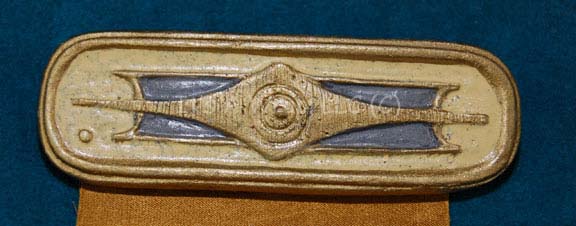 Description: A wire backed cast resin Starfleet Academy ribbon badge featured in the Star Trek: Starfleet Academy personal computer game released in 1997. The item is nearly identical to the resin bars featured as backing for Starfleet emblem badges worn by officers in Star Trek feature films painted gold, off-white, and gray. It features an adhered wire backing and gold colored ribbon fabric. Measures approx. 3 X 1 inch with a 2.25 X 4 inch ribbon.