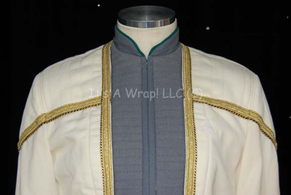 Description: A Starfleet dress uniform style featured in the wedding scene of Star Trek X: Nemesis and in the Star Trek: Deep Space Nine episode “Inter Arma Enim Silent Leges”, as well as opening scenes of Star Trek IX: Insurrection. The uniform consists of a crème-colored jacket with quilted shoulders and a gray quilted bib section; Sciences blue trim with gold and black roping accents the front of the jacket and defines the shoulders. Sciences blue trim is on each cuff as well as on the collar. A small Velcro patch is attached to the left side of the chest for a commbadge (sold separately) to attach. The accompanying trousers are black with gold trim down the side of each leg and have a sleeveless undershirt sewn onto them. The center strip is sciences blue. A sewn in tag reads ‘Wanda Roth, 11-01’ and a costumer’s tag restates the actor’s name.