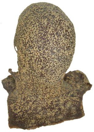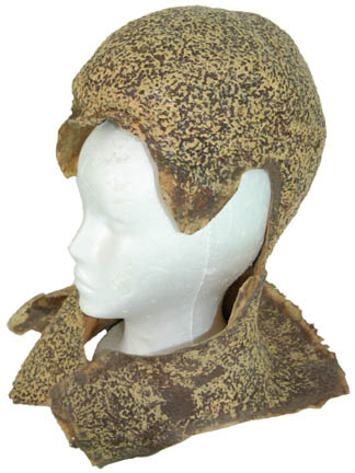 Description: A special effects make-up full head wrap intended to be an adult Suliban appearing variously in episodes of Star Trek: Enterprise. The item is molded foam rubber made to appear blotched and painted brown with a topcoat of tan. The item is in good condition overall with a supple feel generally, the edges of the item are in good condition with some dry areas.