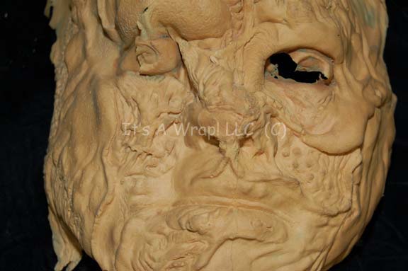 Description: An unfinished, unpainted Vidiian mask like those featured in the Star Trek: Voyager episodes “Faces” where one appeared as surgical alterations to “Commander Chakotay” (Robert Beltran) so he could infiltrate a Vidiian facility to rescue crewmates and in “Deadloc”. The mask is unpainted molded foam rubber with the left eye cut out to see through, and the right eye poked open but not cut to fit. The mouth is not slit. The item covers all of the face to just in front of the ears and goes under the chin. It is in excellent condition even with slightly frayed edges.