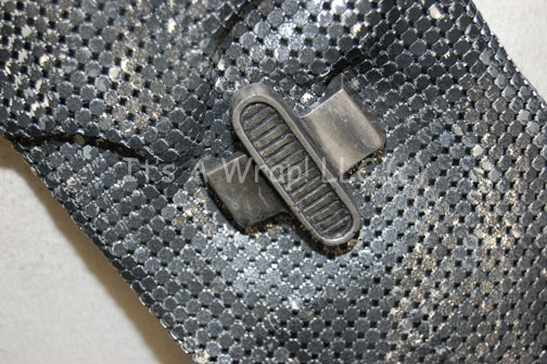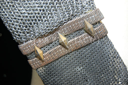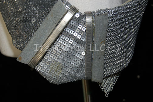 Description: A Klingon baldric sash appearing variously in Star Trek feature films and episodic television. This item is believed to be neoprene covered in fabric with an outer layer of ‘chain mail’ metal elements and trim elements dulled to appear worn. On the interior, black adhesive strips fortify it and the shoulder feature is fitted to hang while the end that hangs at the waist is separated and featured Velcro placements for size or adjustment. An interior label reads “Charles Cooper” (“Kmpec” from the TNG episode Sins of the Father) and “Wayne Grace”, who played multiple Klingons in TNG and ENT; it measures approx. 3.5 inches wide.