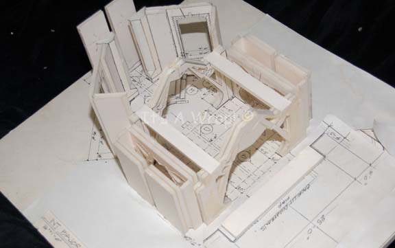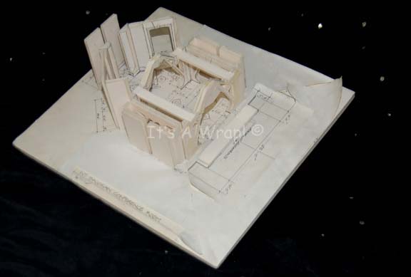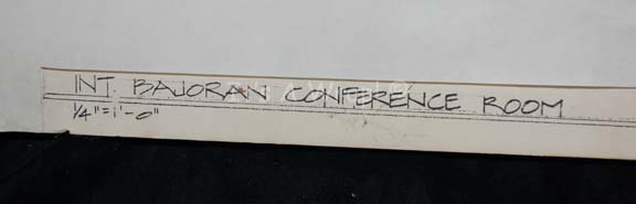Description: A scale model of the Bajoran Conference Room set appearing in the Star Trek: Deep Space Nine episode “The Siege”. The item is made from fashioned white foam core adhered together with white paper coverings to indicate measurements on a slab of white foam core. The item is inscribed ‘INT. Bajoran Conference Room’ and depicts the set that would come into being. The item measures approx. 19 X 17.5 X 5.75 inches. The piece depicts a degree of visible deterioration in that the paper coverings on the base peeled due to a breakdown of adhesive over time.