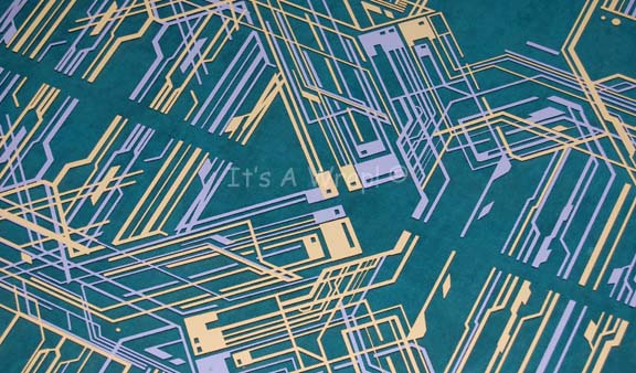 Description: A large prop or set dressing circuit board like those appearing in Star Trek episodic television. The item is a clear sheet of acrylic with purple and orange colored silk screened circuitry on one side. The piece has rounded edges and measures approx. 18.5 X 28.5 inches and is speculated to have been used in episodes of Star Trek: Deep Space Nine because of its production design color scheme.