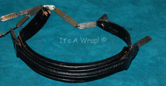 Description: A Klingon costume accessory like those appearing in Star Trek episodic television and feature films. The item is a black leather shoulder aglet with two lengths of specialized chain attached on differing ends.