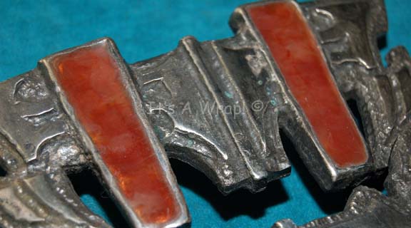 Description: A unique Klingon themed costume buckle created for Star Trek episodic television. The item is made from molded metal with poured resin ‘gems’ and is wire backed for affixing to a costume. The reverse is inscribed ‘Kor’ and may have been planned as an alternate. Kor was performed by John Colicos. The item measures approx. 6 X 3.25 X 0.75 inches.