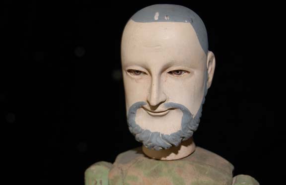 Description: A prop item featured in Star Trek: Voyager episodes like “Scientific Method” and “Concerning Flight”. This item is a prop featured in the holo-program of Leonardo Da Vinci's workshop that “Captain Janeway” (Kate Mulgrew) utilized on several occasions. This painted wooden figurine is attached to its base and has jointed arms and hands that are detachable from the body. The attached head swivels and has an intricately carved and painted face. In these instances, “Leonardo Da Vinci” is portrayed by screen veteran John Rhys-Davies. The item measures approx. 14 x 3 ½ x 3 inches.