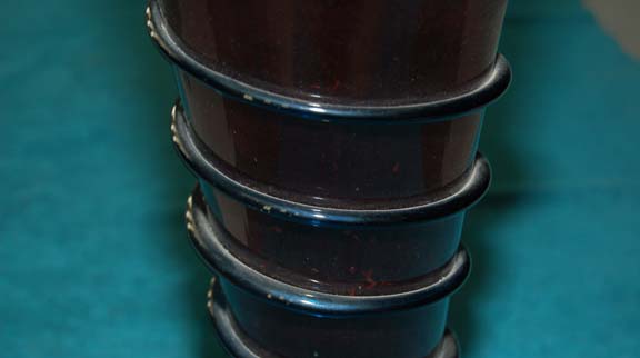 Description: A large colored glass set dressing pitcher appearing variously in Star Trek episodic television or feature films. The item is a cone shaped vase with spiraled glass fused up the exterior and features a sturdy, heavy base. The glass is red colored and fades up at the top to be blue. Measures approx. 19 at its tallest point and 5.75 inches diameter at the base.