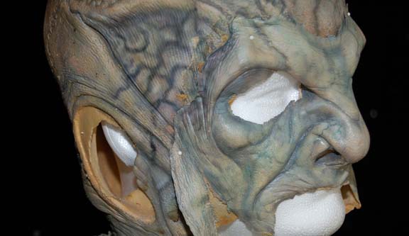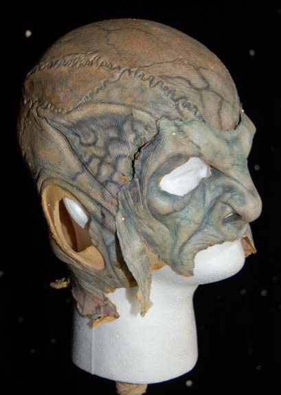 Description: A scalp covering and face mask of special effects make-up created for a Reman character in Star Trek X: Nemesis. The item is painted to reflect the production design of the aliens and changed in hues from gray to tan with minute veins painted in accordingly. The scalp covering is devoid of ears. The face mask is similarly painted and features eye holes. Both items are in good condition, supple and life-like. The edges are dry generally.