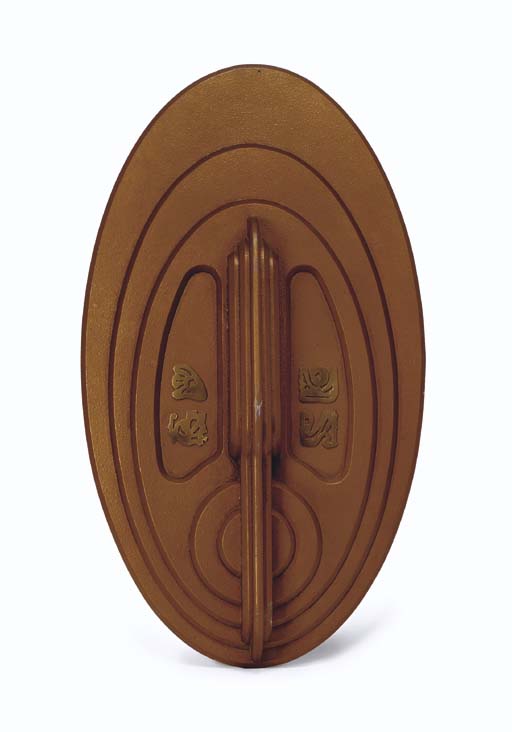 Description: A wood relief sign of the Bajoran symbol, painted as metallic copper, featuring four cut-out Bajoran letters -- <I>28x46in.</I> -- used on the set of <I>Star Trek: Deep Space Nine</I>