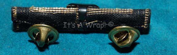Description: A Starfleet officer’s campaign ribbon created for Star Trek VI: The Undiscovered Country and of the style appearing in Star Trek VII: Generations. The item is fabric covered sheet plastic with twin pin backs. The item is colored gold with matching black stripes on the ends and a metal pyramidal embellishment centered. The item measures approx. 2 X 0.5 X 0.5 minus the length of the pin backs.