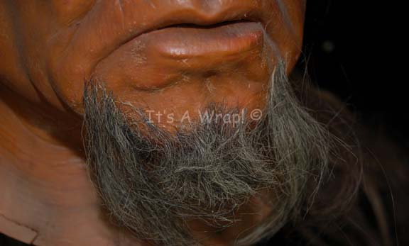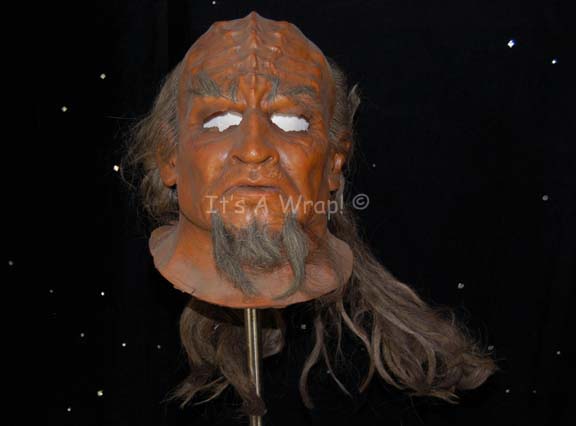Description: This incredible full head Klingon mask was used in Star Trek VI: Undiscovered Country, during a courtroom scene that involved around 200 Klingons. In order to dress that many actors in Klingon makeup, the background actors in the upper balconies wore these full faced masks to make the process quicker than actually attaching individual prosthetics to their faces. This latex head has been completely painted and airbrushed with hair attached behind the forehead ridges. Facial hair has been added for eyebrows and a two part beard. Under the hair at the back of the head is a concealed Velcro strip to allow the wearer to take the mask on and off more easily.
