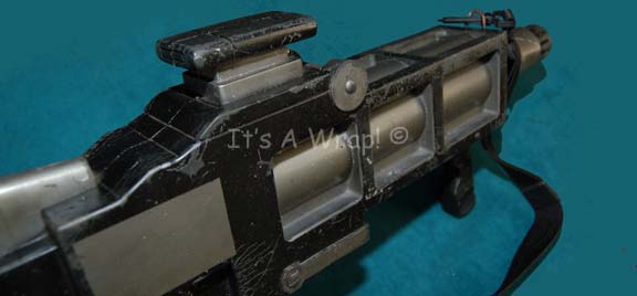 Description: A prop flame thrower weapon featured in the Star Trek: Enterprise episode “Extinction” used by the containment aliens guarding the Loque'eque home world. The item is a molded rubber weapon with painted black and metallic silver details, and a black nylon shoulder strap. The item measures approx. 26.5 X 10 X 3 inches.