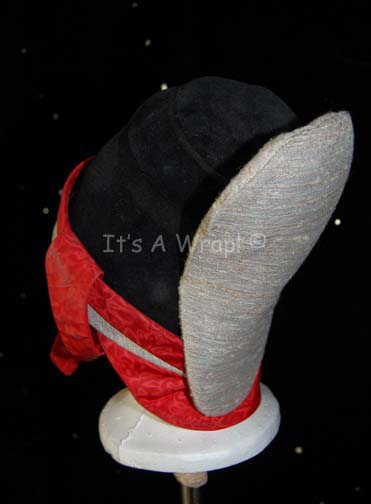 Description: A costume element of the style featured in “Search for Spock” and “The Voyage Home” as well as variously in Star Trek episodic television. A black felt hat in the Vulcan-style, featuring tan trim and accent, more red trim in a floral pattern that covers the neck in the back and an adjustable chin strap, and faux jewel in a stylized ‘arrow’ shape with Vulcan iconographic symbols on it. A sewn in Paramount tag reads ‘2-14 M’.