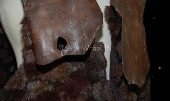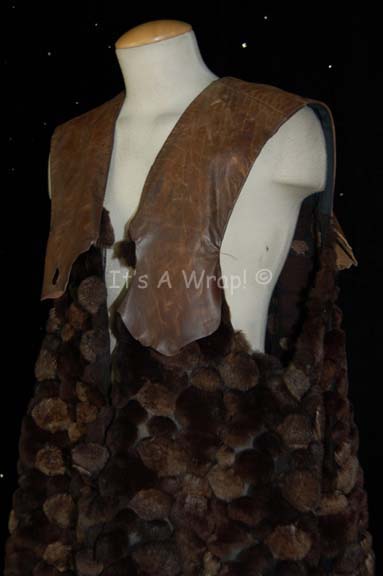 Description: A ceremonial Klingon costume robe like those appearing in the High Council chambers in the Star Trek: Enterprise episode “The Expanse”. The item is a sleeveless cobblestone brown fur robe with brown leather layers around the shoulders. The item features a sewn in Enterprise tag reading ‘Dan Desmond #052’, and feature s a costumer’s tag indicating the components.