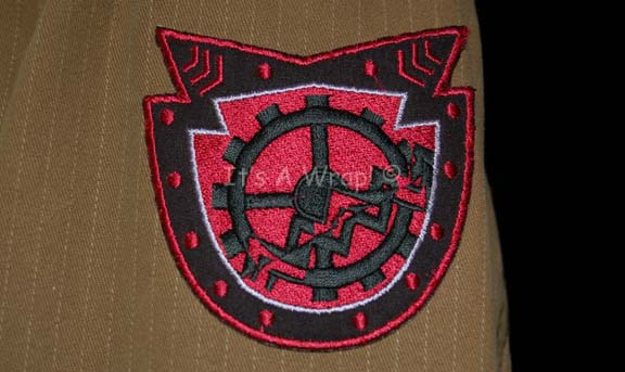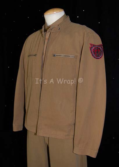 Description: A costume featured in the Star Trek: Enterprise episode “The Communicator”, wherein “Lt. Reed” (Dominic Keating) accidentally leaves his communicator on a pre-warp civilization, goes back for it where he and “Captain Archer” (Scott Bakula) are captured and accused of espionage. The costume is for wear by one of the military on the planet; a long-sleeved, olive-colored, button-down shirt, a matching fatigue-style jacket featuring patches on either arm of that planet’s military, breast pockets, a zip down the front, and a pair of corresponding trousers. The costume garments feature sewn in Enterprise tags.