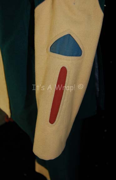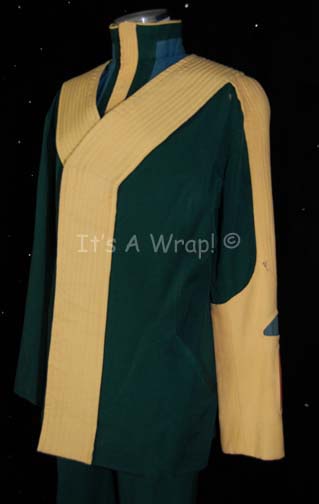 Description: A costume featured in Star Trek IV: The Voyage Home for wear by “Federation Security Council Ushers” in the council chambers appearing at the beginning of the film. The costume is green trousers with yellow chevrons at the ankles, and a uniform top made from matching materials in the same style with one yellow sleeve featuring a red oval accent and a blue triangle. A faux undershirt is represented in a blue dickie with a green collar. The uniform top seals with a Velcro strip and clasps, and the interior features a sewn in Western Costume Co. tag, while an accompanying costumer’s tag reads ‘Ushers, Federation Security Council Chambers and Corridor’.