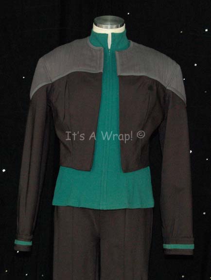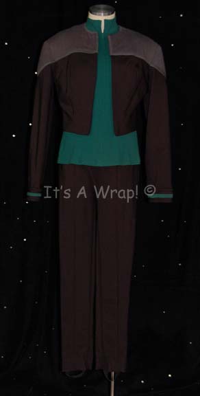 Description: A specialized Starfleet uniform created for Terry Farrell in her performance as “Jadzia Dax” in episodes of Star Trek: Deep Space Nine like “Change of Heart”. The costume is a set of black trousers with a stitched in gray under tank that zips up the spine, the waist features sewn in away team gear loops; a science s blue uniform undershirt that does not zip all the way to the top of the neck; and a uniform jacket with no front zip. The non-standard zip configuration of this costume is meant to create the dressed down appearance necessary for the steamy jungle setting in the episode. The costume components all feature sewn in Deep Space Nine tags reading ‘Terry Farrell’, the trousers piece features a similar sewn in tag reading ‘Dax B’, the costume comes with three costumer’s tags reading ‘DS9, Dax, Terry Farrell’.