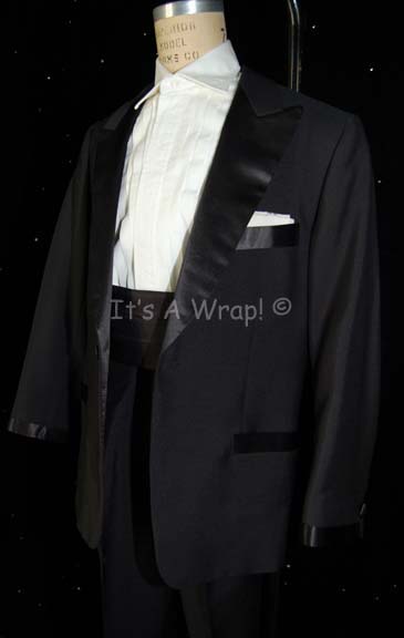 Description: A full dress tuxedo worn by Aaron Eisenberg in his portrayal of “Nog” in the Star Trek: Deep Space Nine episode “It’s Only a Paper Moon”. The costume is a set of black tuxedo trousers with two white tuxedo shirts, a tuxedo jacket with a white folded handkerchief in the breast pocket that is double stick taped into place, a cummerbund, a pair of black socks and a pair of shiny black shoes. The interior lining of the ‘Sy Devore, Sherman Oaks’ jacket is a deep, rich red. The trousers feature a sewn in Deep Space Nine tag reading ‘Aaron’, and a series of costumer’s tags are present with the costume. One reads ‘DS9 #560, Nog, Aron Eisenberg’. An accompanying plastic stir stick was located in the inside left pocket of the jacket.
