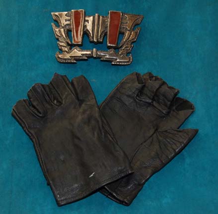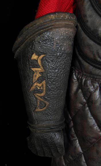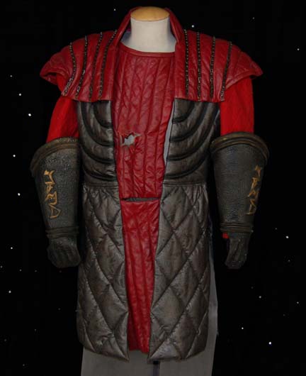 Description: A costume featured in Star Trek VI: The Undiscovered Country for wear by both David Warner Greg Gault in his portrayal of “Chancellor Gorkon”. The costume is a set of elastic topped gray trousers, a large gray colored vinyl costume jacket with multiple sewn in lines of detail, read leather shoulders with metal chain accents, and red fabric sleeves. The costume also comes with an enormous silver colored metal buckle that is inscribed ‘Kor’ on the reverse. Also included are a pair of molded foam rubber gauntlets with gold painted Klingon script, and black leather fingerless gloves. The jacket is the style which appears on screen with a hole in the center where the wearer was ‘shot’ and features a degree of remaining Klingon special effects ‘blood’. The piece can be removed and replaced with a non-distressed piece that is accompanying. That replacement item features a costumer’s tag that reads ‘ST VI, Gorkon Double, Greg Gault’ and indicates components which were not located with the costume. For a more complete costume, some additional items have been added like black colored Klingon spats.