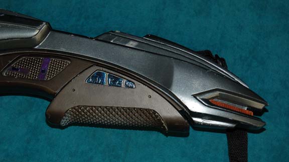 Description: A prop Ferengi disruptor rifle the style of which was featured in the Star Trek: Deep Space Nine episode “The Magnificent Ferengi”. The item is molded rubber with a metallic pewter finish, black painted accents, and an attached black nylon shoulder strap. Props like this were cast as Romulan disruptor rifles, however, the existence of a button trigger and holes on the top where a scope may have been present are consistent with similar on screen used items. The item measures approx. 19 X 8.5 X 3 inches.