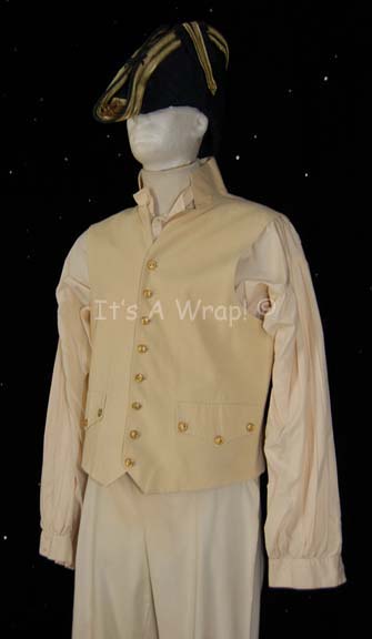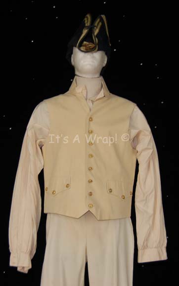 Description: A stunt costume created for the character of “Worf” in Star Trek VII: Generations. The costume is a set of white pantaloons, a white long sleeved button front shirt, and a cream colored button front vest, and a giant black felt hat with a fabric outer lining that is adorned with gold gilt trim. The vest features a sewn in Star Trek VII tag reading ‘R. M.’ and the shirt also features a sewn in tag reading ‘Rusty McClennon’. The costume garments are discolored generally, the knees of the trousers are stained light red, the cuffs of the shirt retain brown colored make-up, the vest is generally clean. This lot represents the last known costume of this configuration yet to be located.