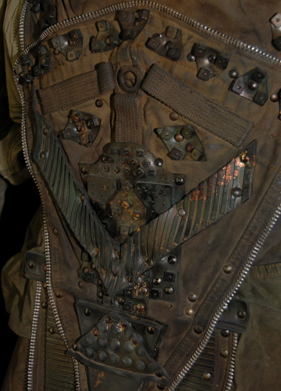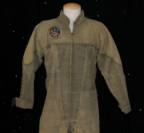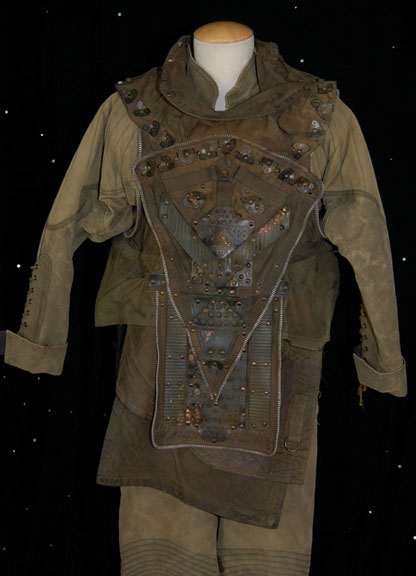Description: A costume appearing in both the Star Trek: Enterprise episodes “Terra Prime” and “Demons” and in Star Trek X: Nemesis. The costume is a durable canvass jumpsuit with multiple lines of threading for detail, a zippered front, a series of laces at the sleeve and leg cuffs, and a vented back. The jumpsuit is adorned by an ‘Orpheus Mining Colony’ patch. The costume also comes with a set of strap on armor like those used by the Kolarans in Nemesis. The armor features stitched in metal, plastic, and rubber components.