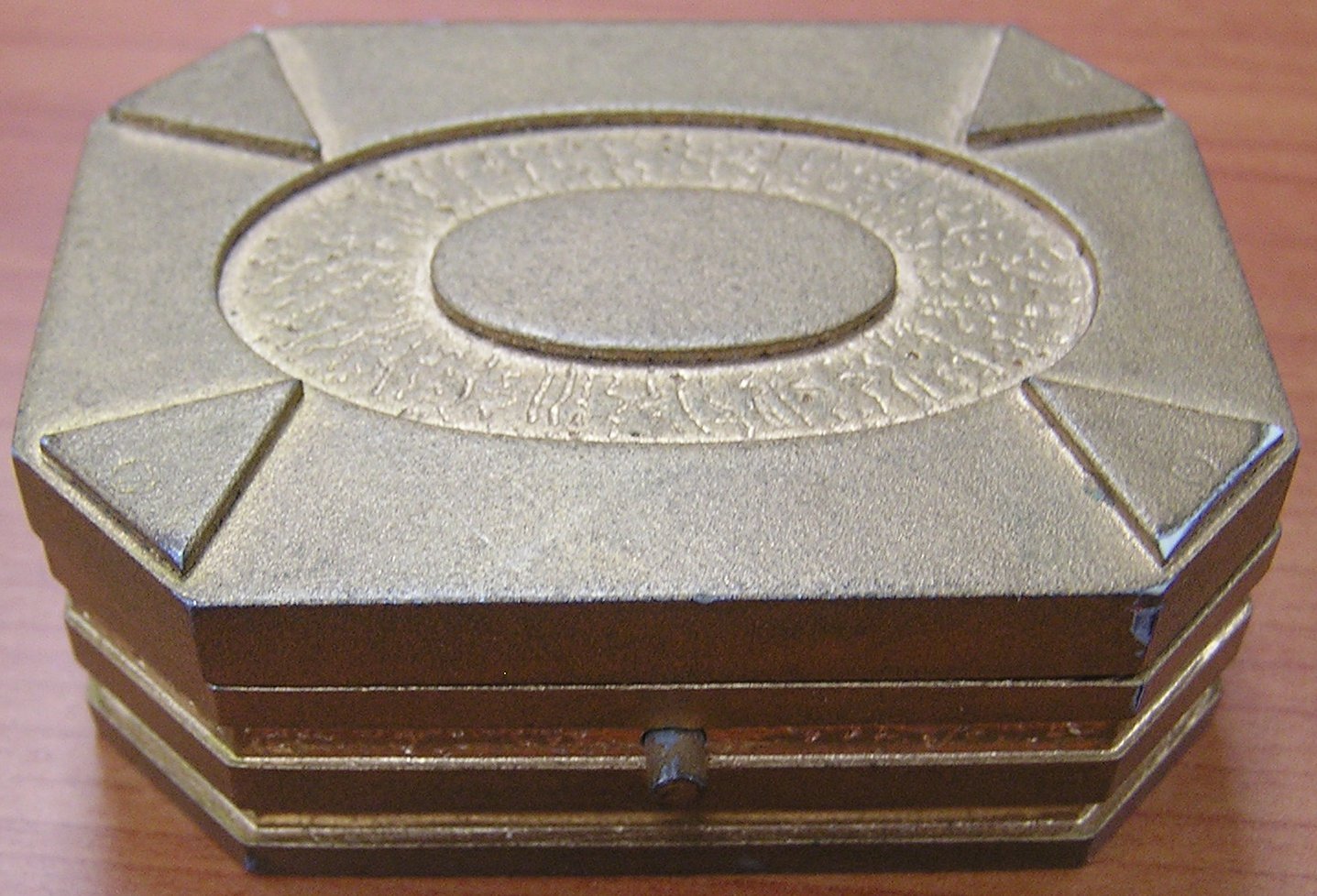 Description: A small, hinged octagonal-shaped plastic box painted as gold -- <I>2x2¾in.</I> -- used as Grand Nagus Zek's beetle snuff box in several <I>Deep Space Nine</I> episodes including "Ferengi Love Songs"