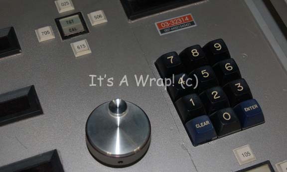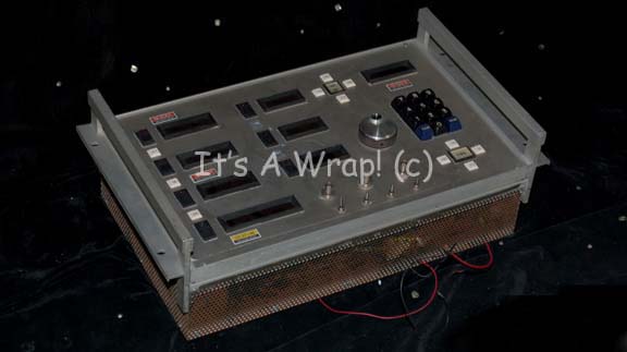 Description: A piece of set dressing removed from a console featured in various episodes of Star Trek: Enterprise. This untested electrical board features multiple functional, and rubber faux buttons, a numbered keypad, a rotating dial, switches, and possible many working lights all set into a board capable of wall or rack mounting. The item is also garnished with four Starfleet inventory applications specific to Star Trek: Enterprise set dressing and props. The item measures approx. 19 X 6.5 X 10.5 inches.