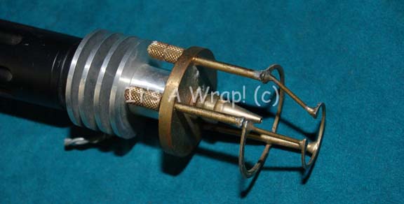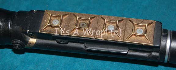 Description: A prop Klingon pain stik like those appearing in episodes of Star Trek: The Next Generation like “Age of Ascension” and “Reunion”. The item is made from machined metal and molded resin with a fashioned wire end. The resin section features metallic gold paint and the hand grip end features black leather wrapping and a clear plastic dome accent. The item measures approx. 31 X 1.5 inches diameter.