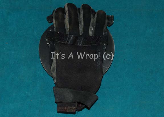 Description: A prop Bajoran springball racquet like those featured in the Star Trek: Deep Space Nine episode “Little Green Men” during the auction of “Nog’s” (Aaron Eisenberg) possessions prior to his entry into Starfleet. The item is a black neoprene glove with Velcro straps adhered to a copper colored machined metal disk on the palm. A name brand logo on the glove reads ‘Pacific Extreme’ and a size label is present internally that reads ‘S’. The item measures approx. 6.25 X 9.75 inches.