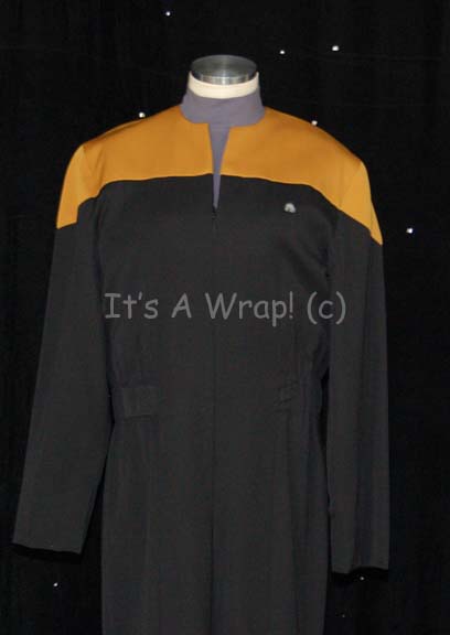 Description: A stunt uniform appearing variously in episodes of Star Trek: Voyager for use by Peter Lai while performing stunts as “Harry Kim”. The costume is a black Starfleet uniform jumpsuit with operations gold shoulders, a zip up the center, sewn in ‘away team’ gear loops on the elastic waist, an interior waist belt, and Velcro cuffs at the sleeve ends and a corresponding grey uniform undershirt. The costume garments feature sewn in Voyager tags reading ‘Peter Lai’ and the jumpsuit depicts only the slightest degree of wear in the form of a tiny spark hole in the right front on the division color.
