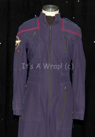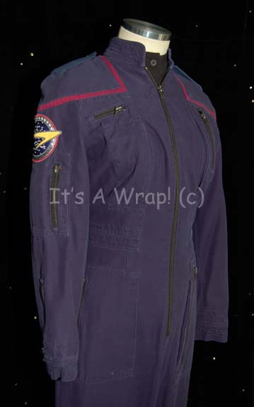 Description: A Starfleet uniform jumpsuit with engineering red division stripes around the shoulders featured in the finale Star Trek: Enterprise episode “These Are the Voyages…”. The costume features multiple zippered pockets and Velcro adjustments, sewn on shoulder epaulettes, a sewn on Starfleet Command patch on the right sleeve shoulder and no assignment patch on the left sleeve shoulder (item depicts evidence of removal). The costume is fit for a female wearer and comes with a black sleeveless button front uniform undershirt.
