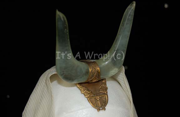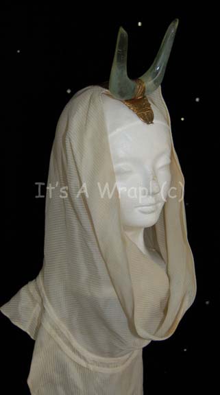 Description: A costume accent believed to have appeared in Star Trek III: The Search for Spock during the Fal-Tor-Pan ceremony. The item is a molded metal headpiece with a fashioned resin ‘V’ shaped horn affixed to it that is matched to a crème colored hood. The headpiece is curved to set on the scalp of the wearer and features a hidden cap that can be used to pin the piece to hair. The hood is open around the face and billows down the front of the body. A slight degree of spotty discoloration in the fabric is visible due to time and storage conditions. The horns measure approx. 4 X 4 X 0.75 inches.