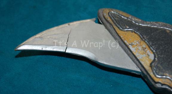 Description: A prop knife like one appearing in the Star Trek: Deep Space Nine episode “To the Death” for use by Jem’Hadar soldiers. The item is molded rubber on a metal internal framework painted metallic silver and pewter with gold colored accents. The ‘blades’ on either end have bent over and reveal the interior framework by way of cracking. The item measures approx. 14.75 X 3 X 0.5 inches.