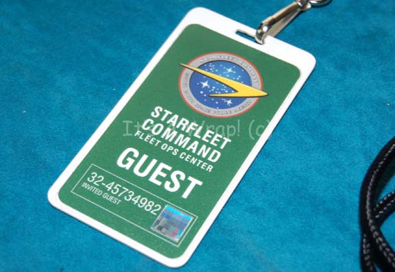Description: A prop gust badge created for the Star Trek: Enterprise episode “First Flight” and appearing on various alien visitors in “Demons” and “Terra Prime”. The item is fashioned from thin white colored sheet plastic with a differing graphical application adhered to both the face and reverse. The graphics depict the logos of ‘United Earth’ and ‘Exploration’ with ‘GUEST’ clearly spelled out and a set of instructions that include phrases of dialogue heard in “Star Trek”, “The Blues Brothers”, and songs by ‘The Beatles’. The reverse features a logo of the ‘United Earth Space Probe Agency’ and indicates the wearer to be an ‘Invited Guest’ to ‘Starfleet Command Fleet Ops Center’. The item measures approx. 3.75 X 2 inches with a 20 inch black lanyard.