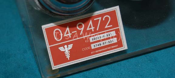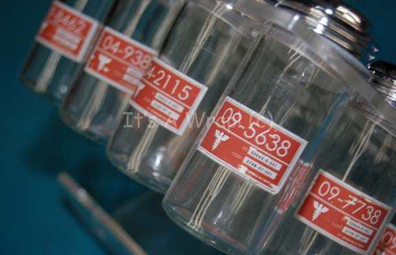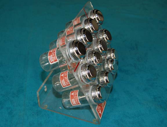 Description: A set dressing container selection appearing variously in episodes of Star Trek: Enterprise. The item is a clear acrylic rack with rubber no-skid feet on the base an d openings for twelve accompanying glass shaker jars. The jars each feature a chrome colored screw off lid with a rubber ring to keep it in place and all but one of the jars feature red themed Starfleet inventory applications with numeric values and white cadesus graphics. The rack also features a similar application and red adhesive detail lines. The item measures approx. 8.75 X 8 X 6 inches and features screw hole positions on the reverse for wall mounting.